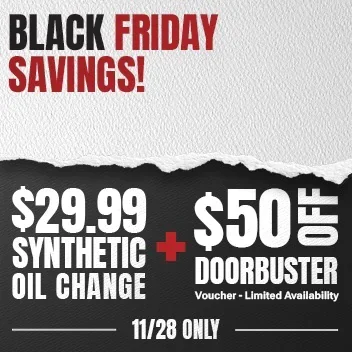 *Purchase Full Synthetic or Synthetic Blend Oil Change for $29.99. Service includes up to five (5) quarts of motor oil, new oil filter and complimentary digital vehicle inspection. Vehicles requiring special oil or more than five quarts of oil may incur additional costs. Price good for most cars & light trucks. No diesels. Must present coupon at time of service. Cannot be combined with any other coupon, offer or discount. No rainchecks. State or Local taxes and/or surcharges, as applicable. Certain restrictions apply. Valid 11/28/2025 and 12/1/2025 ONLY.